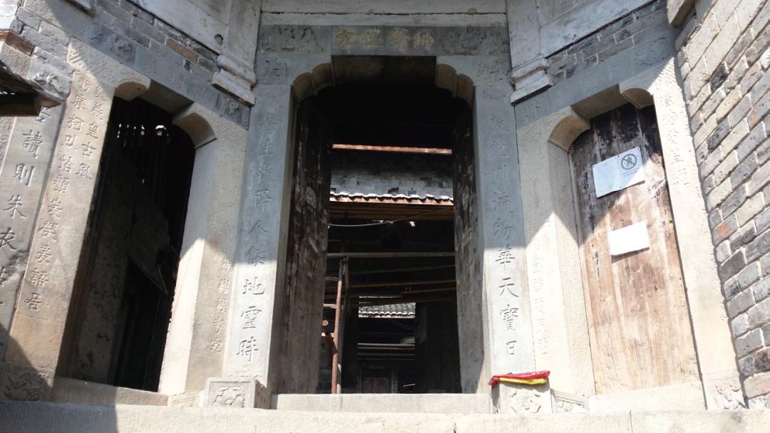 民居设前后两道朝门,第一道朝门呈八字形,开一道正门、两道耳门。朝门门框高26米,设11步台阶。朝门石坊上刻有各种花草动物和人物故事,门框刻写对联“敦化川流物华天宝日,松生岳降人杰地灵时”,门楣题“耕读传家”。左右两侧耳门也题刻楹联,左门楹联是“睹云山而苍翠载兴载夺宛若蓬莱佳境,盼庭柯以恰颜爱笑爱语居口羲皇古风”,门楣题“出则悌”。右门楹联为篆书,题“两面云山拥户,优焉游焉,时培心上地;满空星斗照楼台,悠也久也,长养性中天”,门楣题“入则孝”。