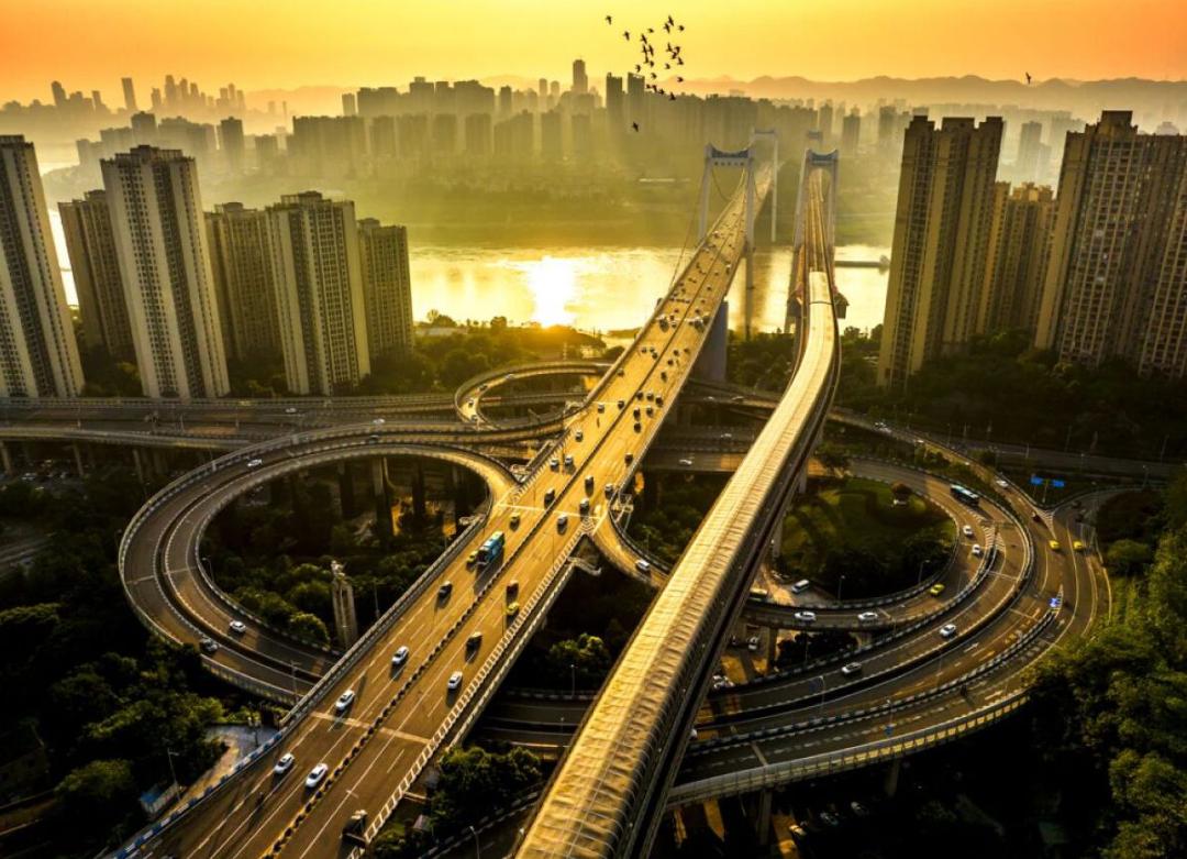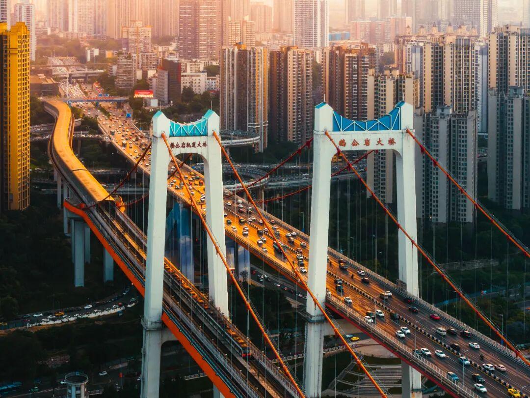 与其相距约45米的鹅公岩轨道大桥,曾是世界最大跨径自锚式悬索桥,主跨600米,2018年5月合龙时创下该类型桥梁的世界纪录。该桥全球首次采用“先斜拉、后悬索”的施工工艺,技术复杂、技术含量高,两桥并肩飞跨长江,串联九龙坡与南岸两区,极大便利市民出行。余晖之中,轨道列车在桥上穿行,既展现了重庆独特的立体交通结构,也成为山城人民日常生活的动人画卷。