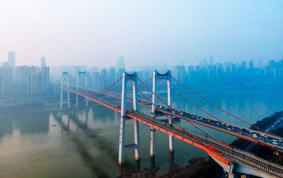 鹅公岩大桥横跨在长江之上,是中心城区首座双斜拉悬索桥,它是连接九龙坡区与南岸区的过江通道,为门型双塔柱悬索桥,桥面布置为双向8车道,整体线条简洁、流畅,极具线性美感。