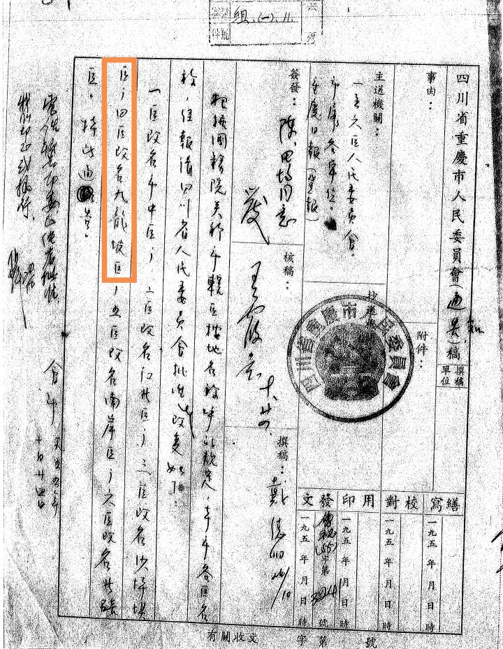 1936年11月6日,为推动成渝铁路建设,成渝铁路工程局公函中提出建设“九龙坡”车站,是目前考证的官方文件中首次出现九龙坡地名。