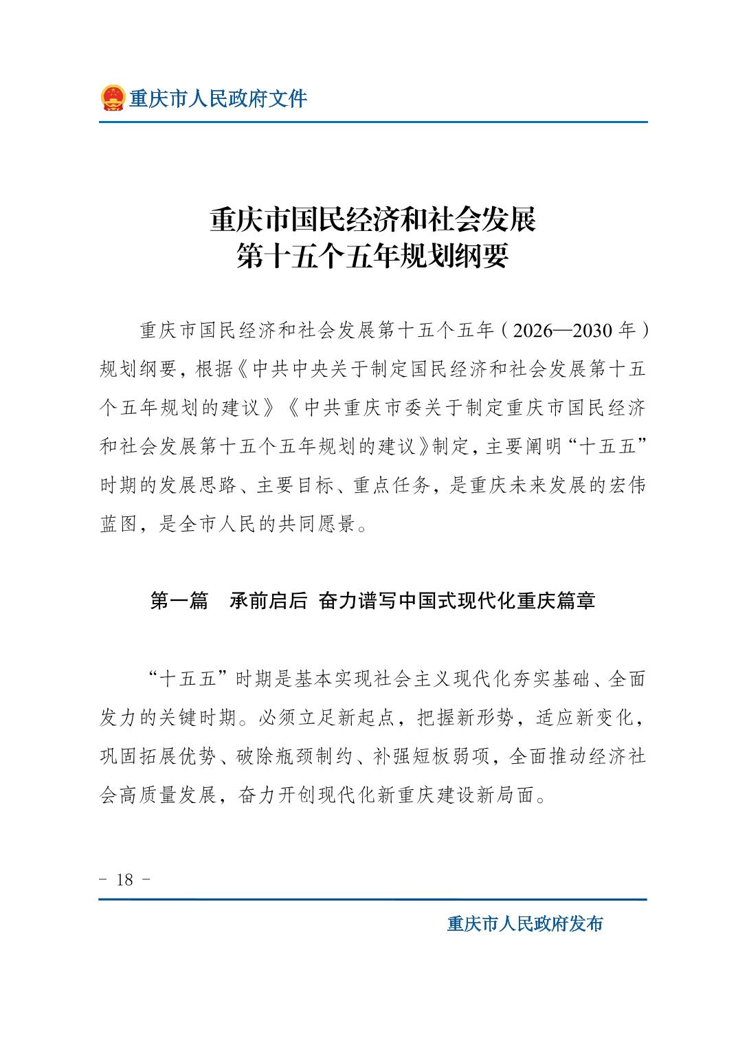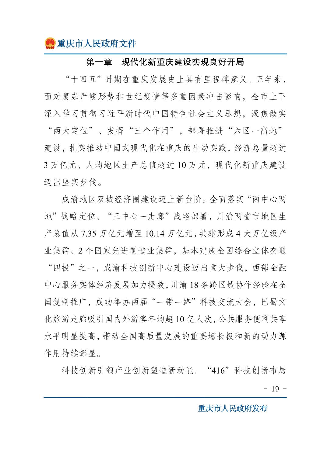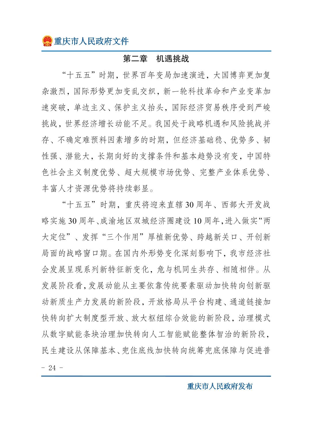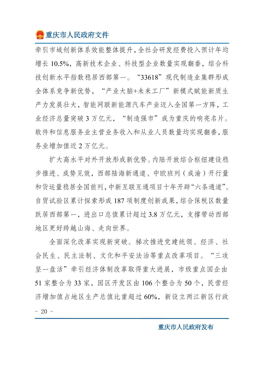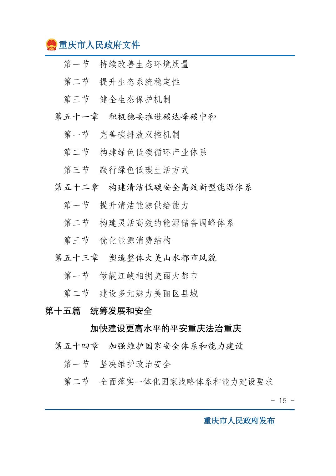 重庆市人民政府关于印发《重庆市国民经济和社会发展第十五个五年规划纲要》的通知