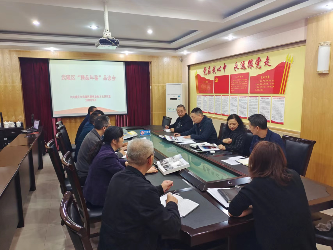 11月4日,武隆区委党史地方志研究室召开“精品年鉴”品读会,对《连云港年鉴(2019)》《长沙年鉴(2020)》 《北京朝阳年鉴(2020)》 《孝义年鉴(2020)》 《璧山年鉴(2020)》进行认真品读,精学精品,并结合《武隆年鉴》编纂实际,对2022年卷框架完善、特色类目设置、分目调整等进行讨论。年鉴编辑人员分别就精品年鉴框架设计与地方特色方式、精品年鉴彩页设置与随文图片的运用进行专题发言,评选推荐《精品年鉴框架设计与地方特色突出方式——以“精品年鉴品读季”4部“中国精品年鉴”为例》作为武隆区“精品年鉴品读季”主题征文上报重庆市地方志办公室。