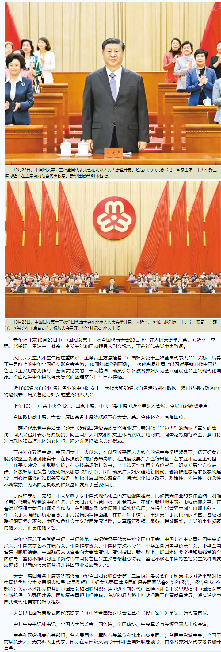 中国妇女第十三次全国代表大会在京开幕 习近平李强赵乐际王沪宁蔡奇李希到会祝贺 丁薛祥代表党中央致词